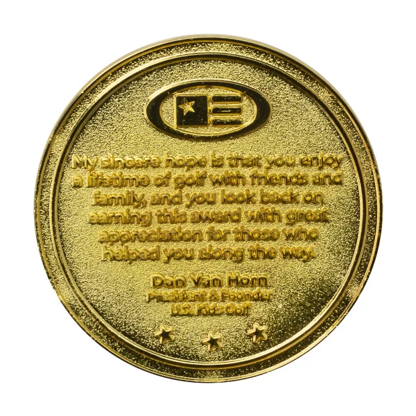 Recognize your golfer as they achieve the significant milestone of passing Level 5 of the Player Pathway. The Gold Star Player Coin is a special award provided to players as they complete the first five levels and move on to become advanced golfers in Levels 6-10. This 2″ gold coin comes packaged in a green velvet box and is a great keepsake.